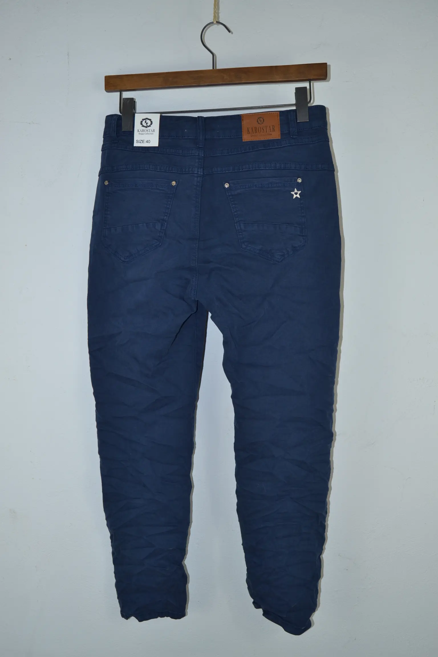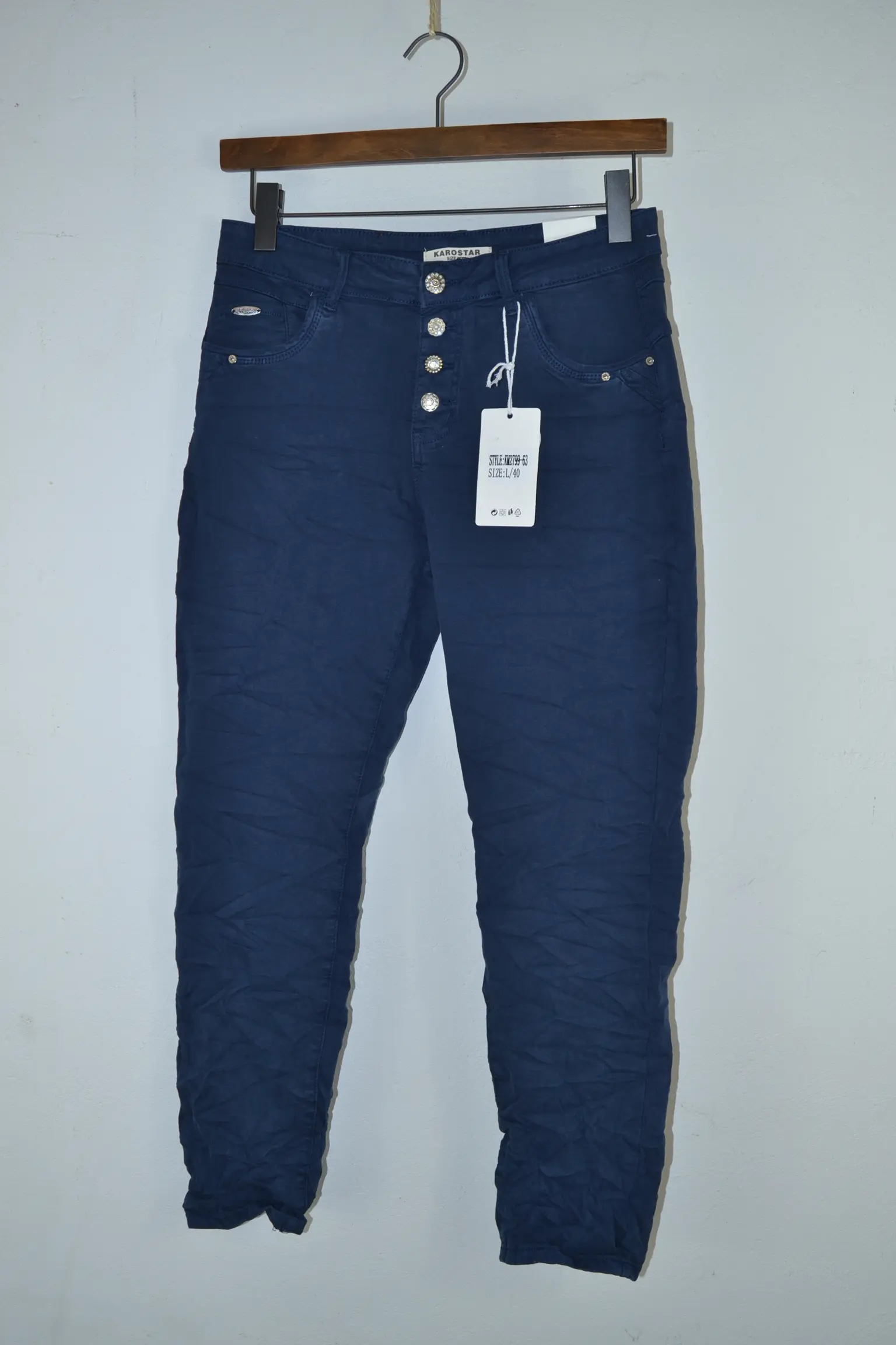 Leder du efter navy blå damejeans med meget stræk, 4-knaps lukning og høj komfort, er Karostar KM2799-63 Navy Blue et oplagt valg.
