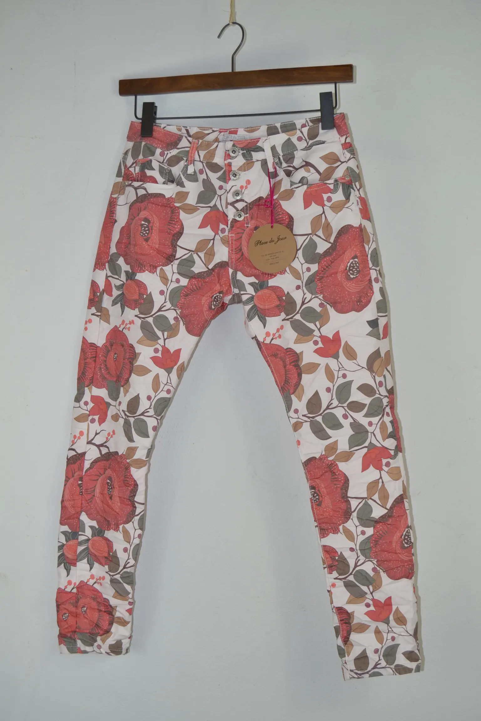 Hvis du leder efter lange damejeans med rose print, stretch og moderne pasform, er Place du Jour Red Rose Jeans et oplagt valg.